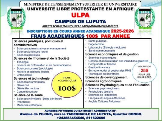 Le nouveau manager de l’ULPA campus de Luputa est plus que déterminé à faire entrer et asseoir son institution dans le concert des grandes. Dans cette optique, Michaël Tshibangu promet un corps enseignant compétitif. Notez que l’université libre protestante d’Afrique organise plusieurs facultés ou domaines. L’affiche mise en avant présente toute la gamme des filières à trouver à l’ULPA, campus de Luputa sans oublier son adresse physique.